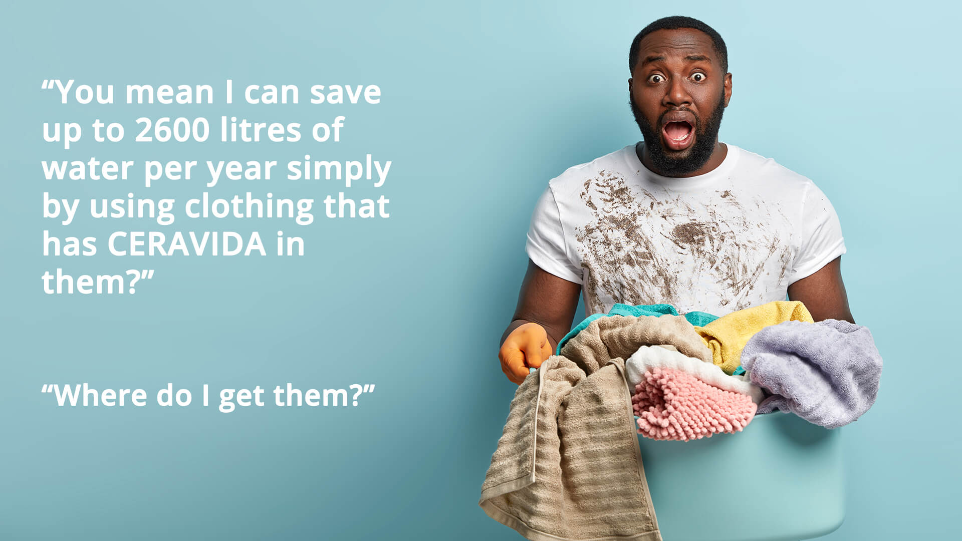 In fact you can wear even your sports clothing for up to 3 times before they need to be washed. You will save on average between 1200 and 2600 litres of water per year simply by having products that have CERAVIDA in them, based on 2 & 4 star rating washing machines.