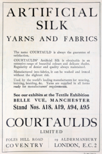 为了降低对天然丝的依赖,Courtaulds率先通过粘胶工艺制造人造丝,从而在纺织业的技术发展中处于领先地位。1904年,Courtaulds成立了第一家在考文垂生产人造丝的工厂,并将其织入埃塞克斯郡Halstead Mill的织物中,使Courtaulds成为世界领先的人造纤维生产公司。