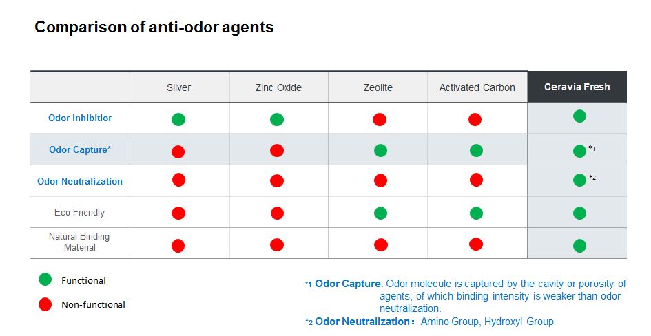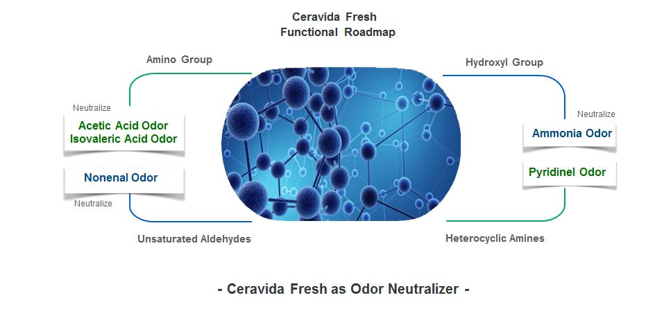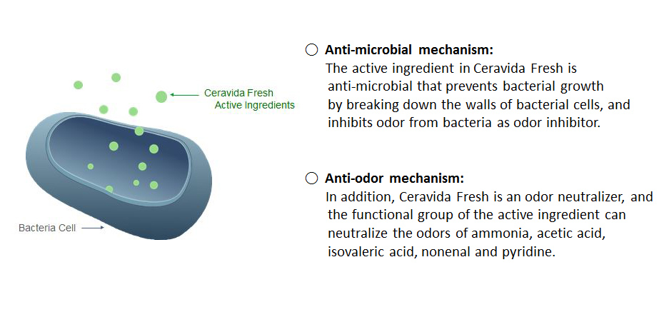 Ceravida Fresh absorbs the sour odor of acetic acid, a sweat-causing substance, eliminating odors after extensive washing.
